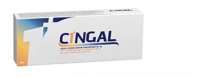 Cingal is designed with a combination of high molecular weight, cross-linked hyaluronic acid gel that contains micronized triamcinolone hexacetonide particles. The hyaluronic acid mimics the action of synovial fluid and helps to lubricate the affected synovial joint. The other active ingredient — micronized triamcinolone hexacetonide — is a type of rapid and long-lasting synthetic glucocorticosteroid with excellent immunosuppressive and anti-inflammatory activities that help to alleviate inflammatory symptoms of OA. Following an intra-articular injection of Cingal, the pain of OA is successfully suppressed